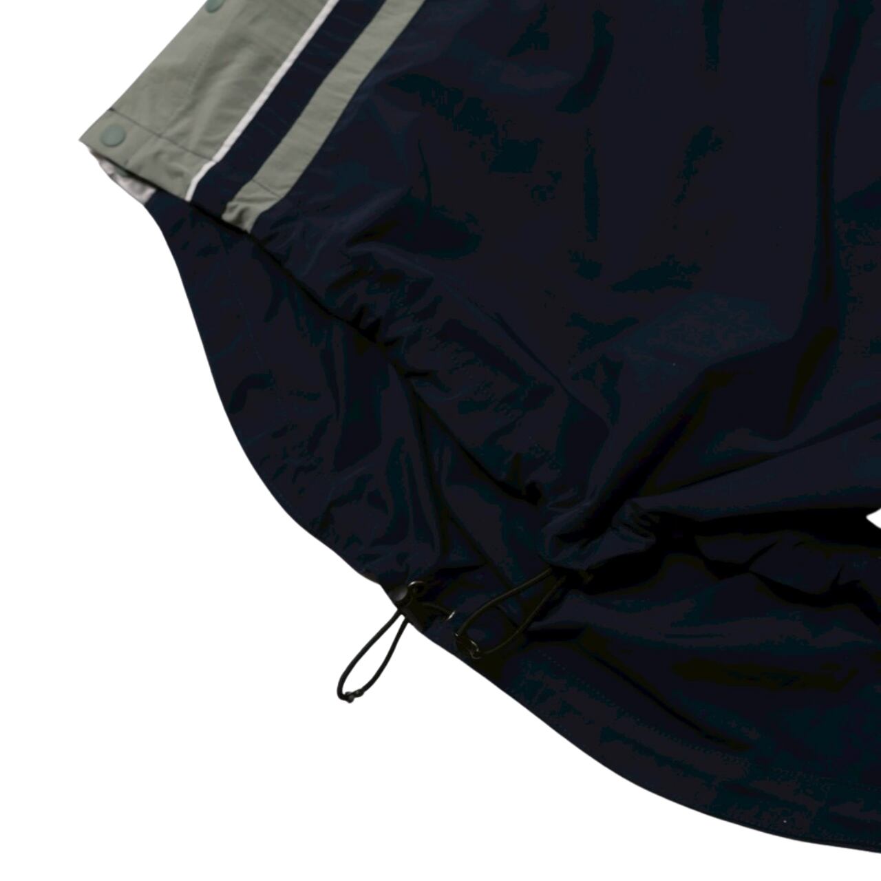 更に、前後にドローコードとストッパーを搭載。裾を縛る事で着丈の調整が可能になり、シルエットの変化も楽しめます。