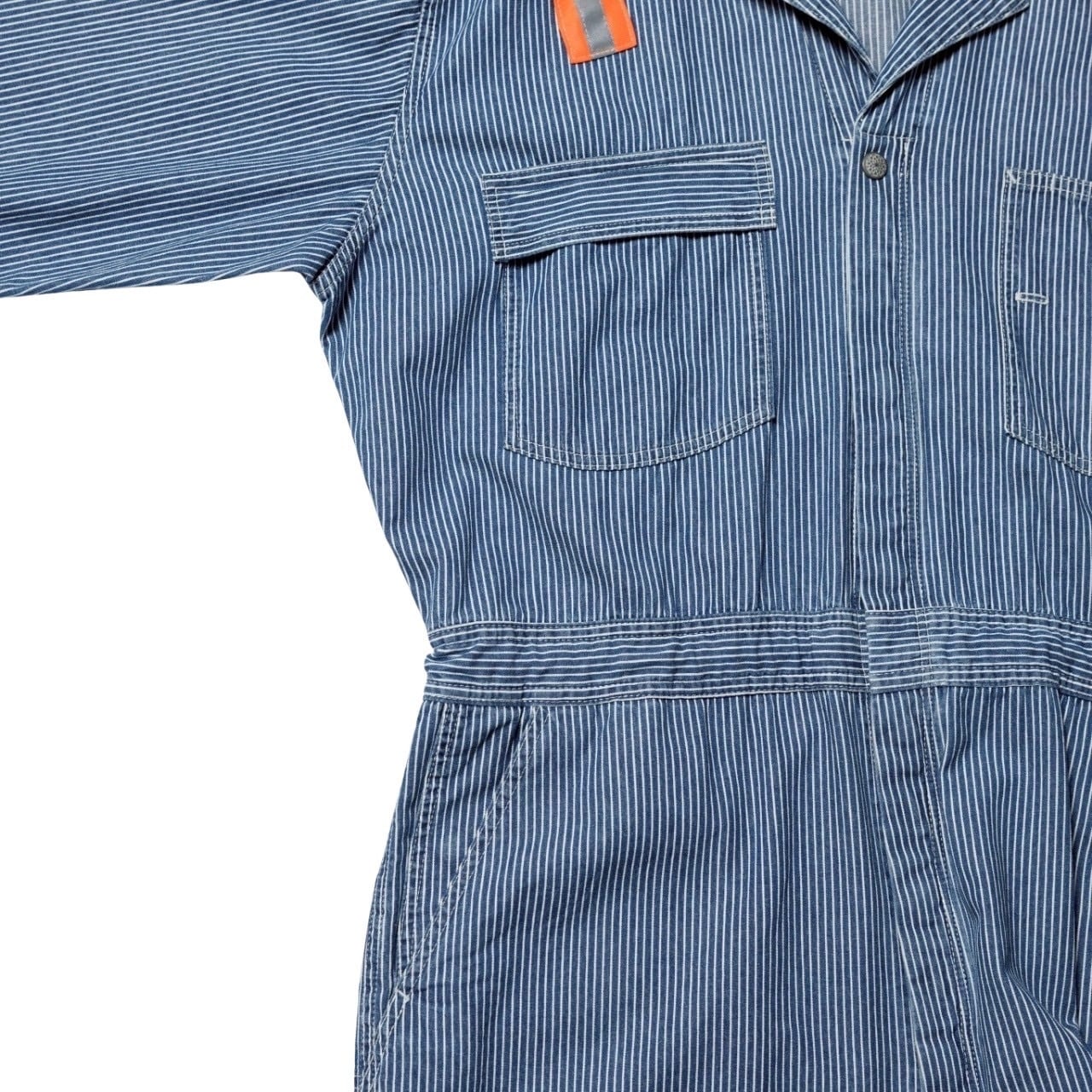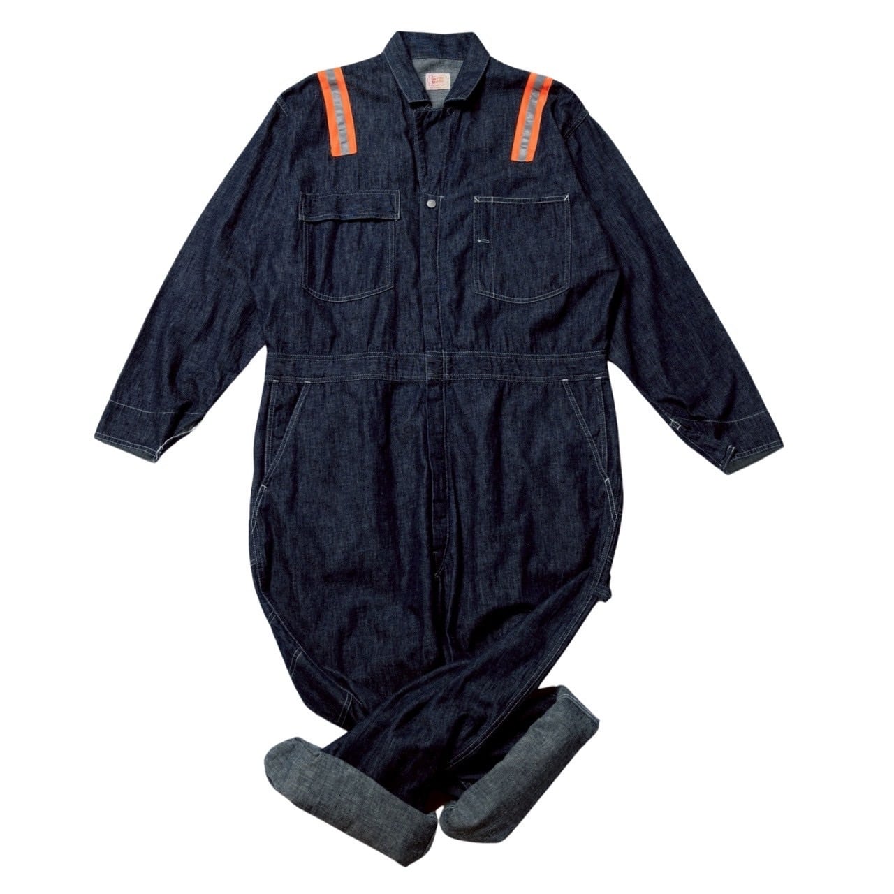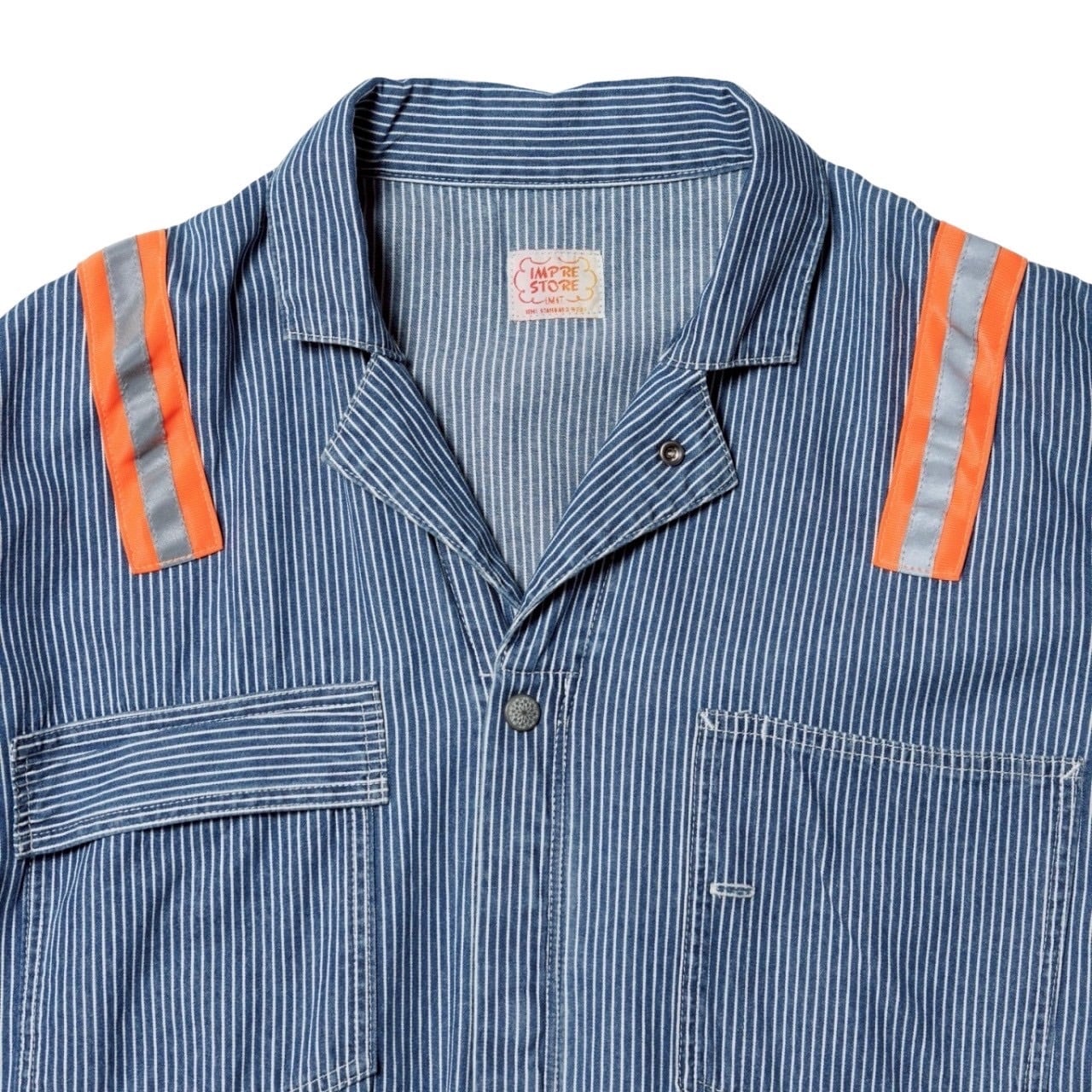 蛍光トリコットテープの上にリフレクターテープを重ね縫いし、ワッペンと共に90’sリアルワーカーの空気感をプラス。